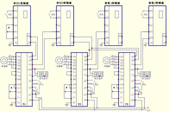 電氣連接如圖4,變頻器啟動(dòng)、停止控制端,電位器輸入端,模擬量輸出端根據(jù)不同品牌而定。控制器T1的同步線速度信號(hào)取之于牽引1變頻器,收卷控制器T2、T3同步線速度信號(hào)取之于牽引2變頻器,K12、K22和K32為測(cè)試時(shí)使用,平時(shí)可不外接。